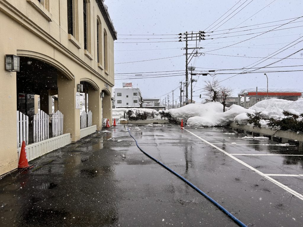ホテル前駐車場、第二駐車場は消雪パイプを作動させております。